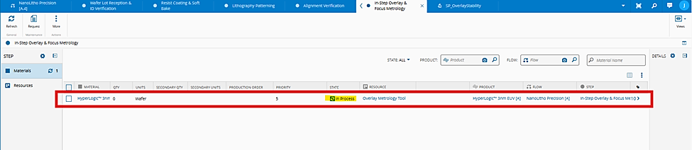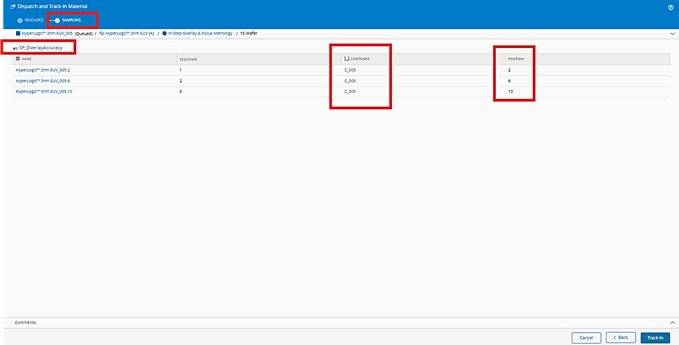 At the In-Step Overlay & Focus Metrology step, perform Dispatch & Track-In on a Material lot with a Container containing the identified positions for its Sub-Materials. For details on the transaction itself, see Track-In Material.