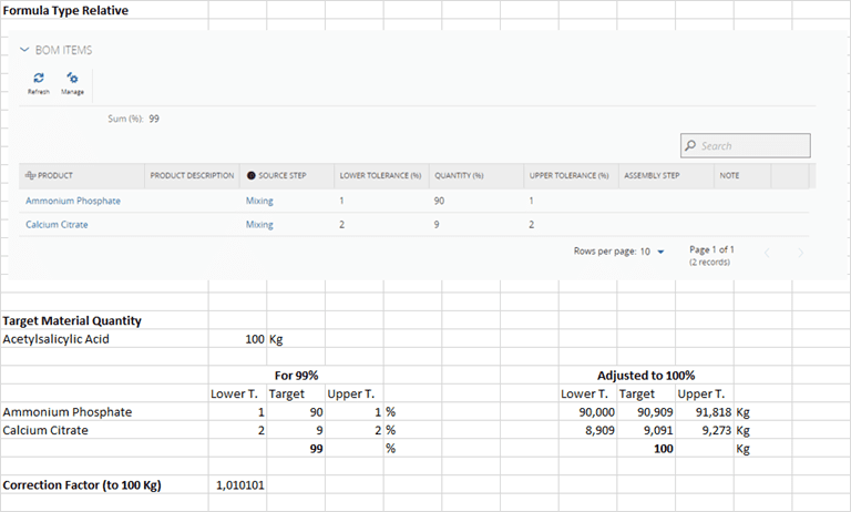 | Relative | - Formula is expressed in relative values (percentages). - The sum of the BOM quantities must add up to a value between 99 and 101 (%). - Tolerances are expressed as percentages against the calculated dispensed quantity. |
