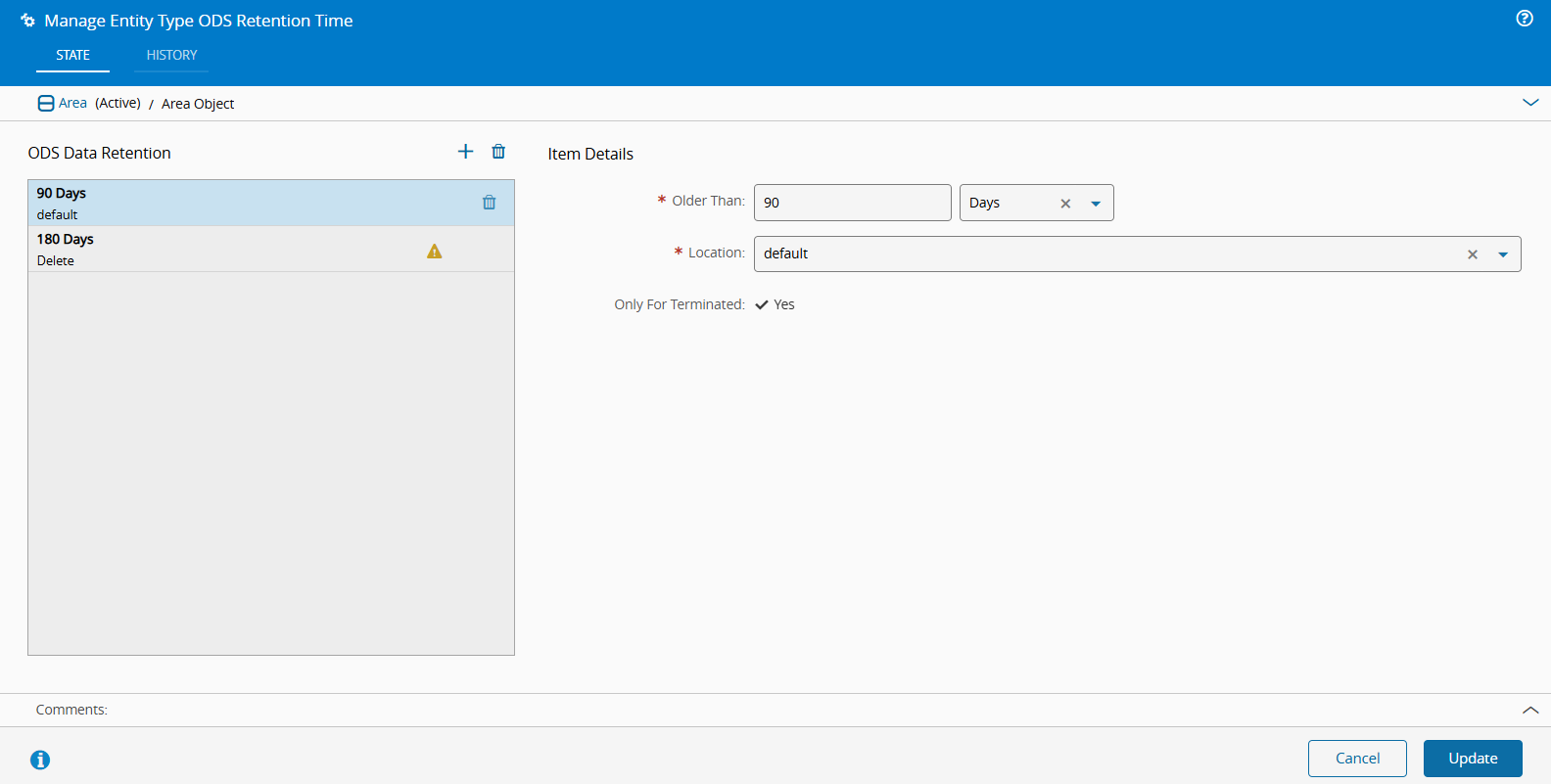 4. After defining all retention times, select Update to apply the configuration.