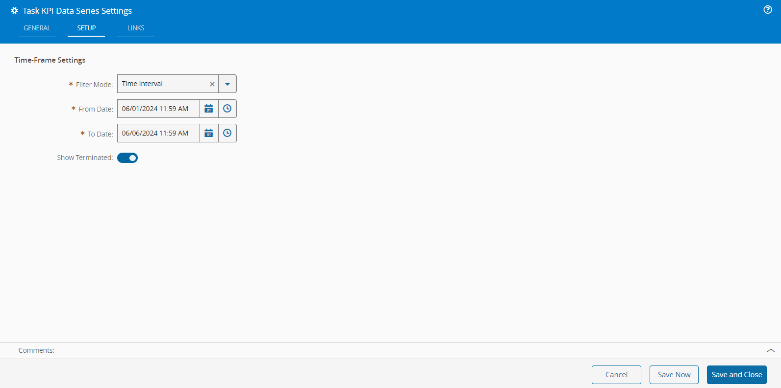 The KPI Data Series task includes a Setup tab where you can configure the time frame using: