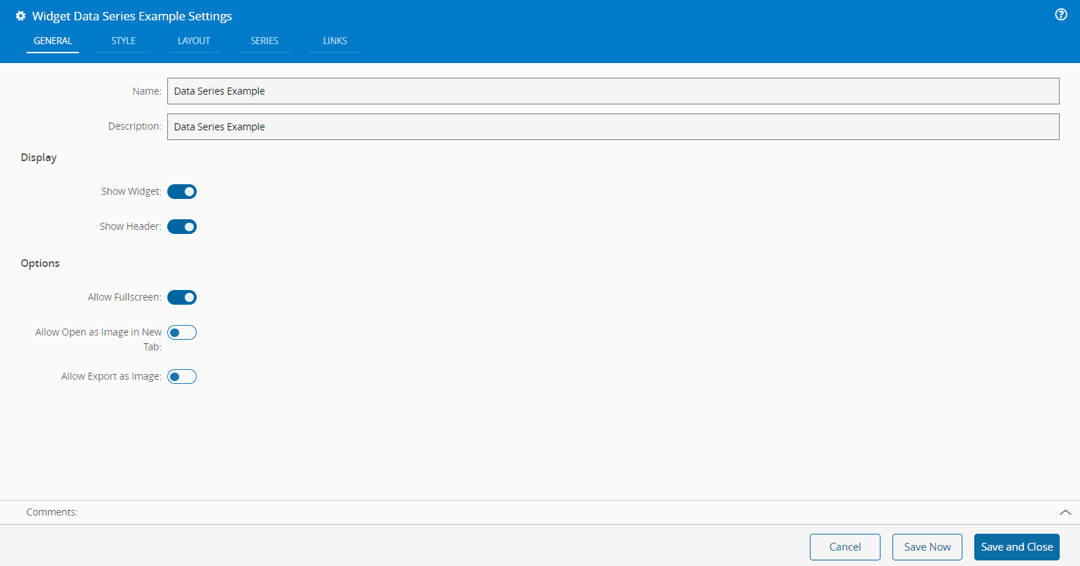 - In the General tab, provide a name and a description for the widget. Use the toggle buttons to specify whether the widget should be visible, display the header, or allow full screen mode. Additionally, determine if the widget can be opened as an image in a new tab or exported as an image.