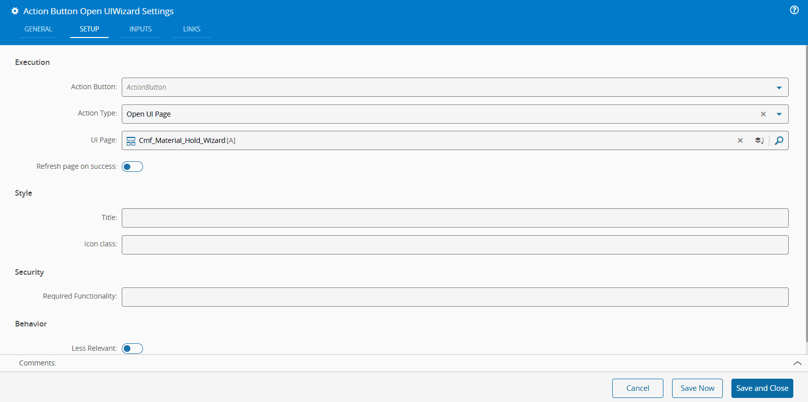 In the Action Buttons Settings for the Open UIPage button, navigate to the Setup tab, and choose the Open UI Page Action Type. Additionally, specify the target UI Page (for example, the