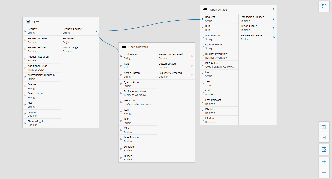 Connect the Form widget in the UI Page to the Action Buttons using the Links diagram, as shown below.