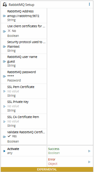 | Activate | Boolean | Triggers the task to establish the connection to the RabbitMQ broker using the provided and configured settings. |