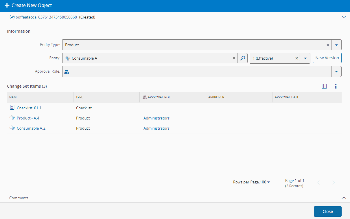 - If you want to create a new version for an existing object, select the Entity Instance from which you want to create a new version and select the New Version button.