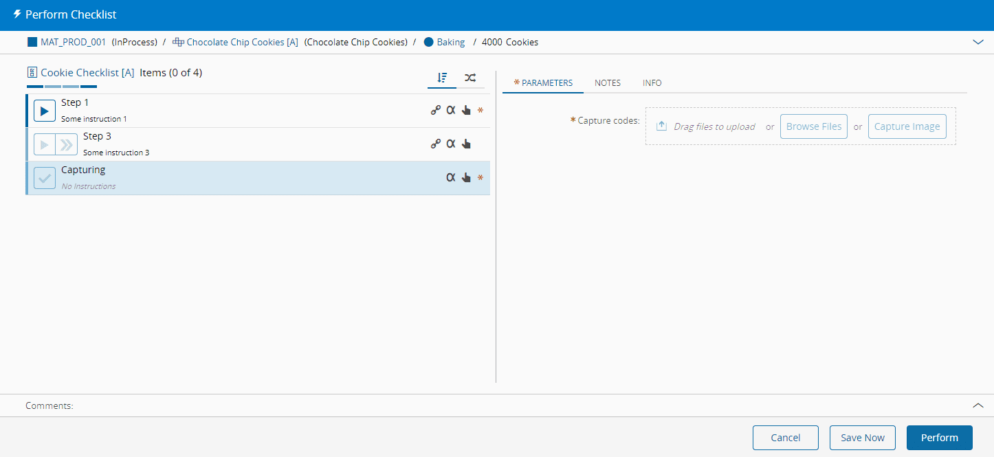For Checklists performed in Immediate mode, the perform can be concluded by completing all items and selecting Perform Immediate. For Checklists performed in Long Running mode, the state of the Checklist will be committed to the database after each Checklist Item is completed, or after you choose Save and Close. When all Checklist Items are completed for a Checklist performed in Long Running mode, you can only select Close.
