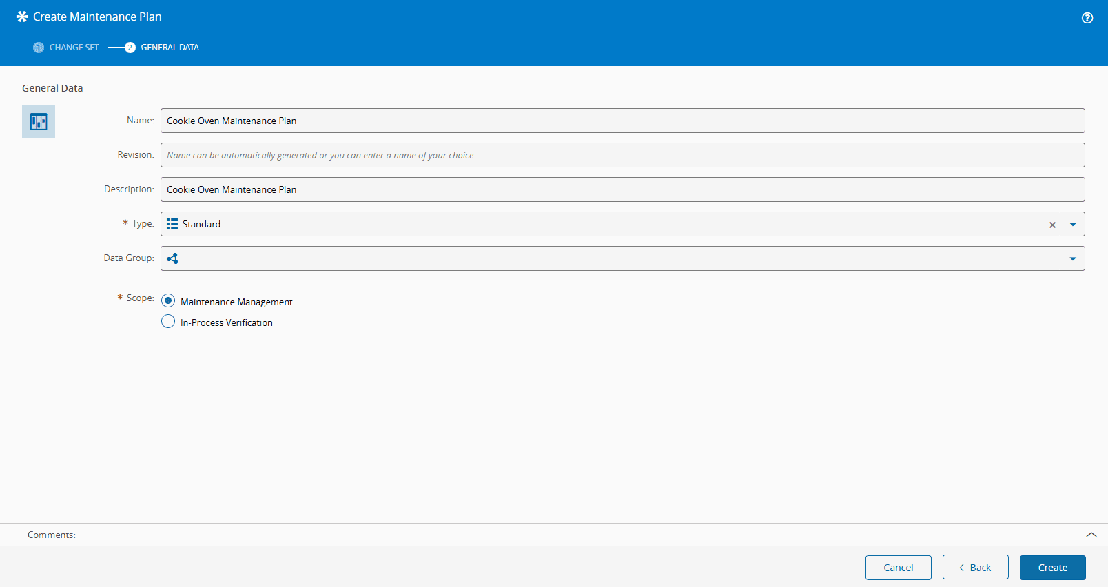 If when creating the Maintenance Plan the selected Scope is In-Process Verification, the Maintenance Type property will be set to this Scope and cannot be changed.