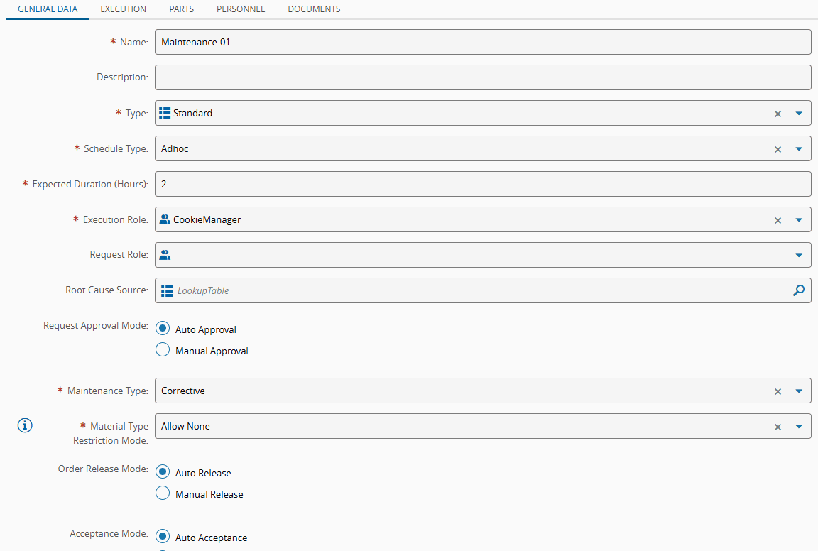 - Specify the Execution Role for this activity - this represents the group of people who is authorized/qualified to perform the maintenance task.