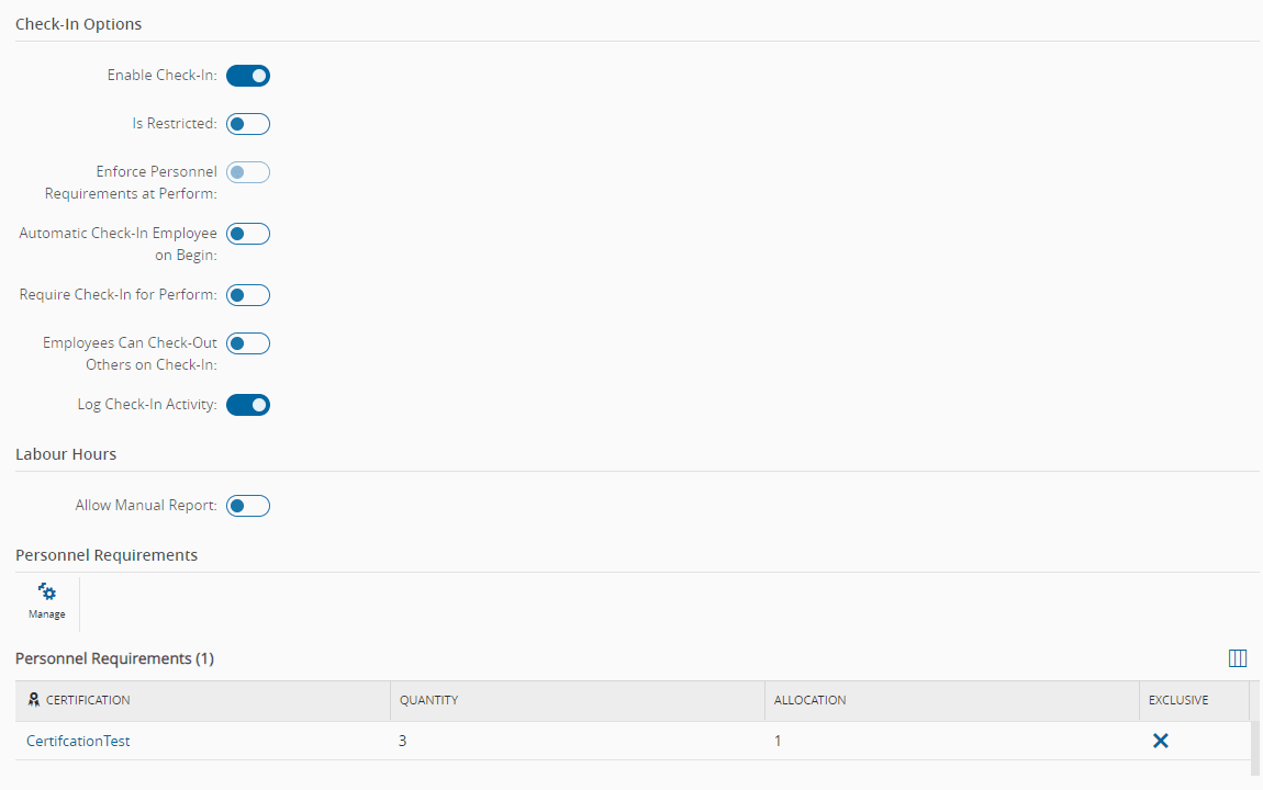 Specific personnel requirements can be configured by selecting the Manage button in each of the Personnel Requirements section.