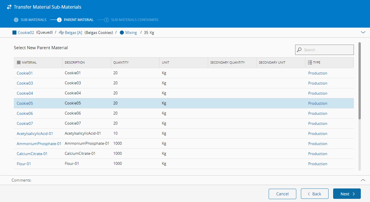 - The Top-Most of Parent Material From and Top-Most of Parent Material To must be at the same Facility and Step (including Logical Step Name), and have the same Is In Line Step and Line Flow Version property values.