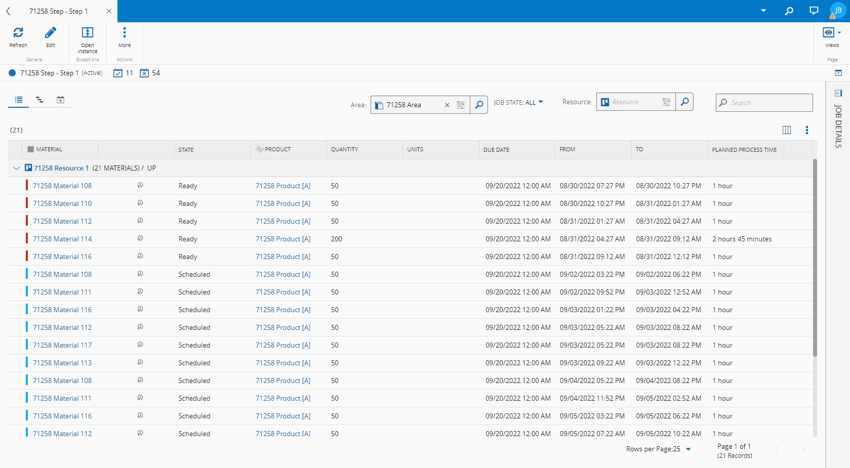 The Schedule View is available when the Include in Scheduling property is set to true. This view provides a timeline view of the Materials set to be processed at this Step. You can filter by Area, Resource or job state.