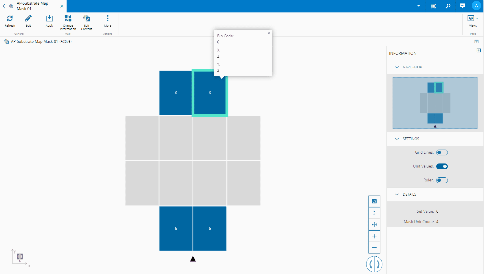 It is also possible to pan, reset view, flip vertically/horizontally, zoom in, zoom out, and rotate the Substrate Map Mask. Additionally, by selecting a cell, a pop-up will provide you with information that is specific to that cell: