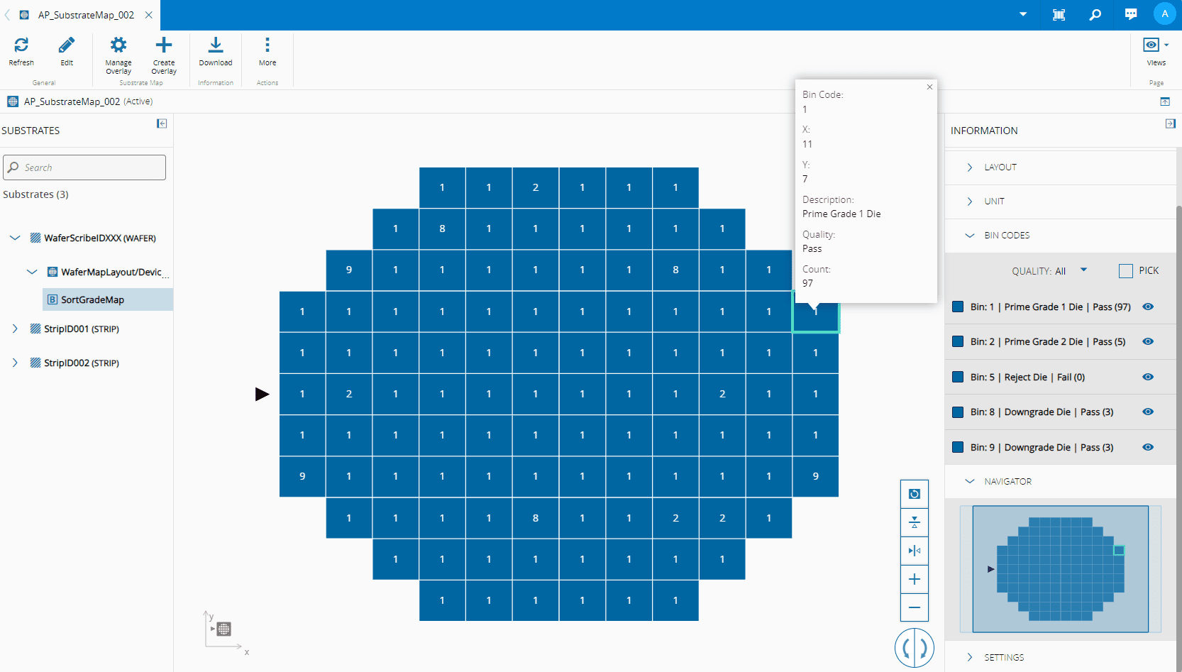 It is also possible to pan, use the select mode, reference device mode, reset view, flip vertically/horizontally, zoom in, zoom out, and rotate the Substrate Map. Additionally, by selecting a cell, a pop-up will provide you with information that is specific to that cell: