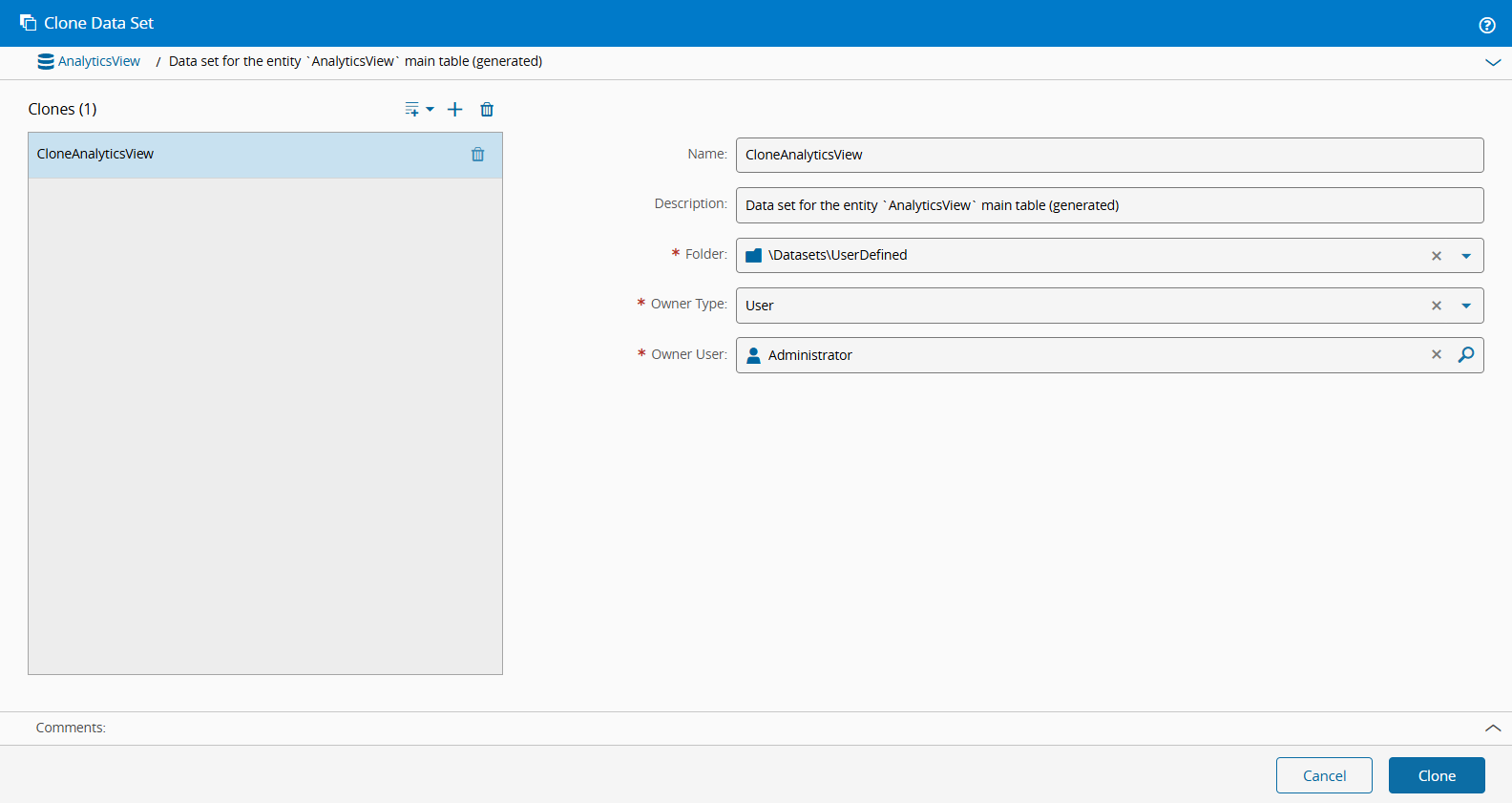 The Clone Data Set wizard can be called from the Data Set page within the Data Platform Group. The default values will be taken from the current Data Set to be used as a base for the new object.
