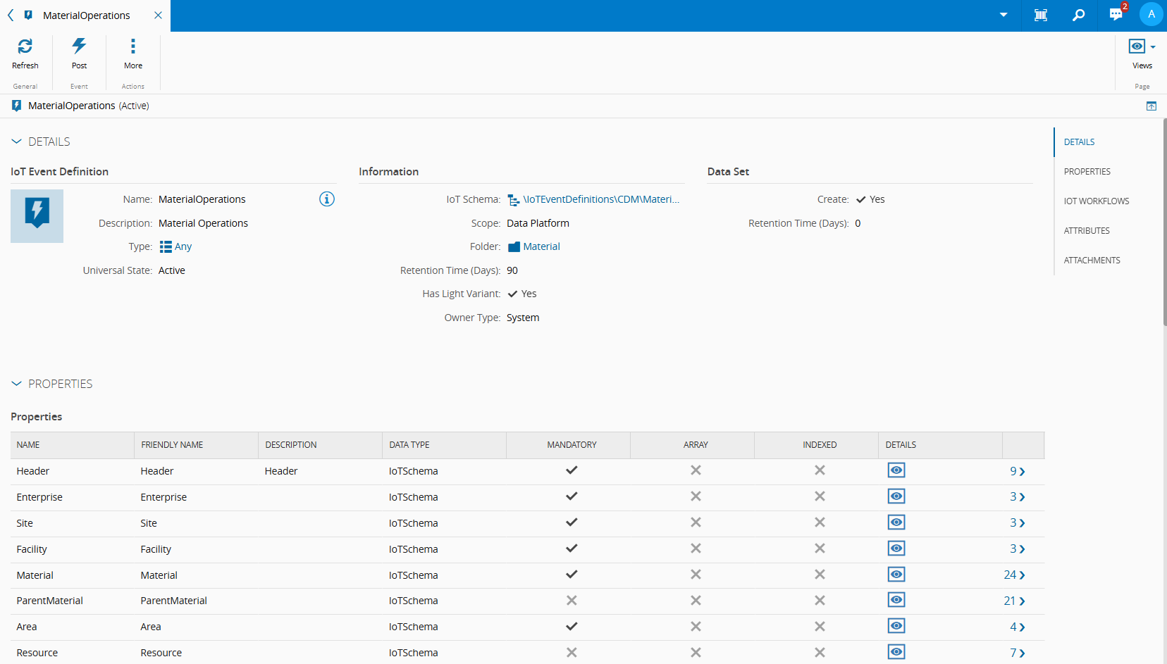 This section lists all the properties this IoT Event Definition includes. A paginated table can be viewed below presenting information on Data Type, Is Mandatory, Is Array, or Is Indexed properties. If it is an Iot Schema you can further drill down on the structure of the selected property.