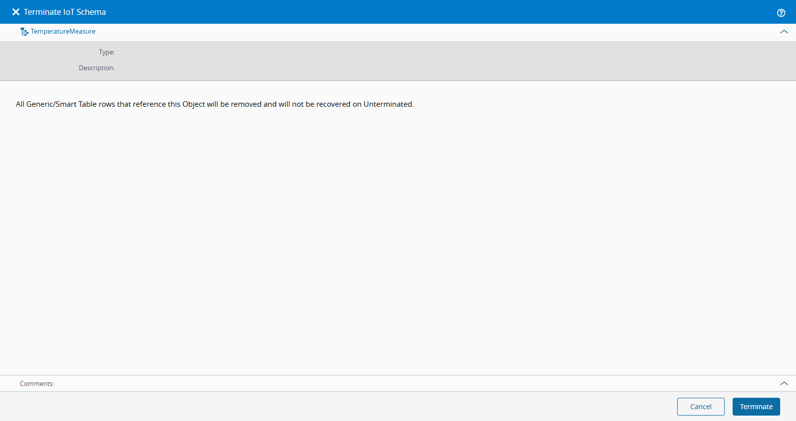 Select Terminate to perform the operation. All generic/smart table rows that reference the current object will be removed and will not be recovered if the object is unterminated at a later point.
