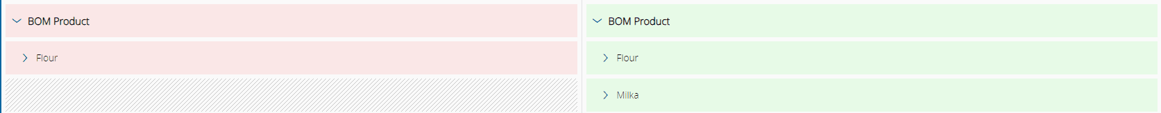 If it exists only in the first entity, it will be shown with a red background in the first entity and a striped background in the second one: