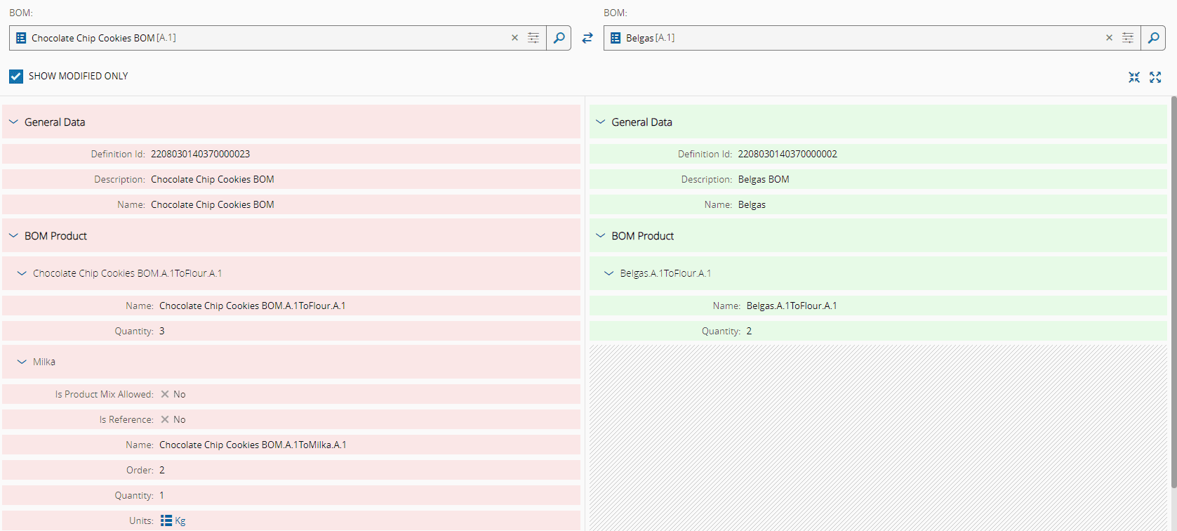 All entities listed above will have a Compare view, accessible through the dropdown located in the top left corner of the entity page. After changing to the compare view, the current entity will be selected on the left side and you can search for an object of the same entity type to see a side-by-side comparison of the properties from both objects, as well as second-level properties which are also displayed on-screen. When you open the comparison view, an entity is already selected, but you can change any of the two entities in the same comparison view, provided they match the entity type. For example, if you open BOM B1 and search for B2 to compare B1 vs B2, you can also choose to compare BOM B3 and BOM B4 from within the same page.
