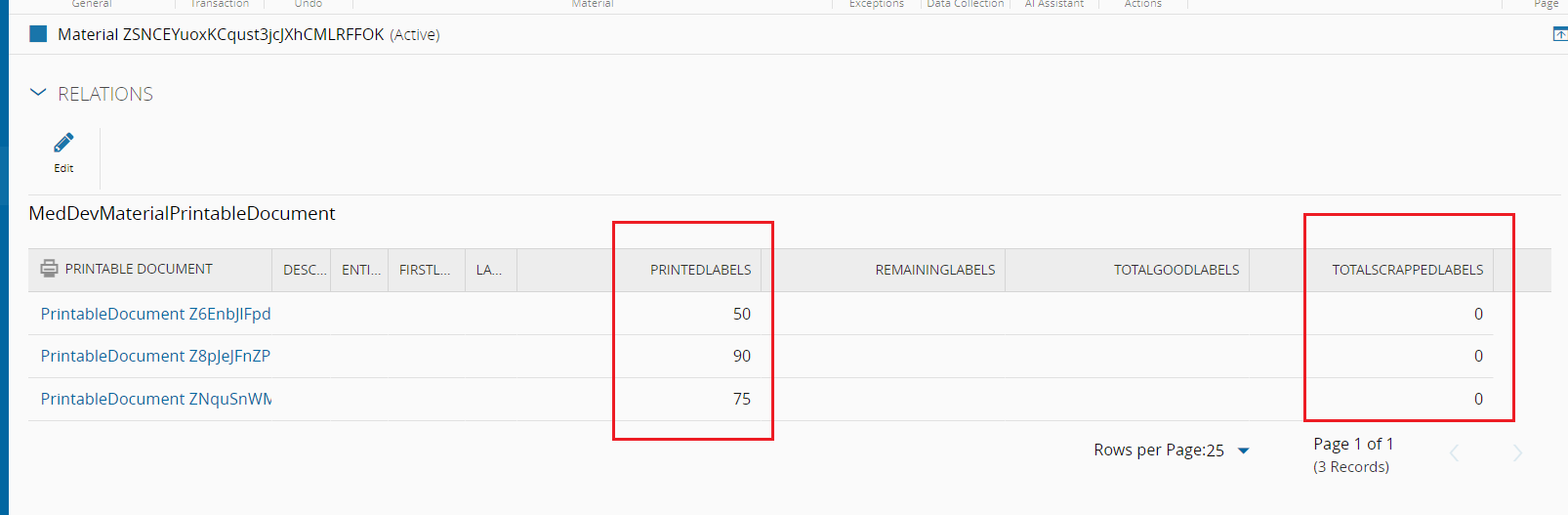 MedDevMaterialPrintableDocument is a Relation Entity Type between the Material and Printable Document, and it keeps track of the count of all the labels printed and verified for each printable document, to be later used during reconciliation. Even though the relation is editable, in normal situations, the values should only be updated indirectly via Data Collections or document printing. Access to Material relation changes can be restricted by the Material.Edit security feature.