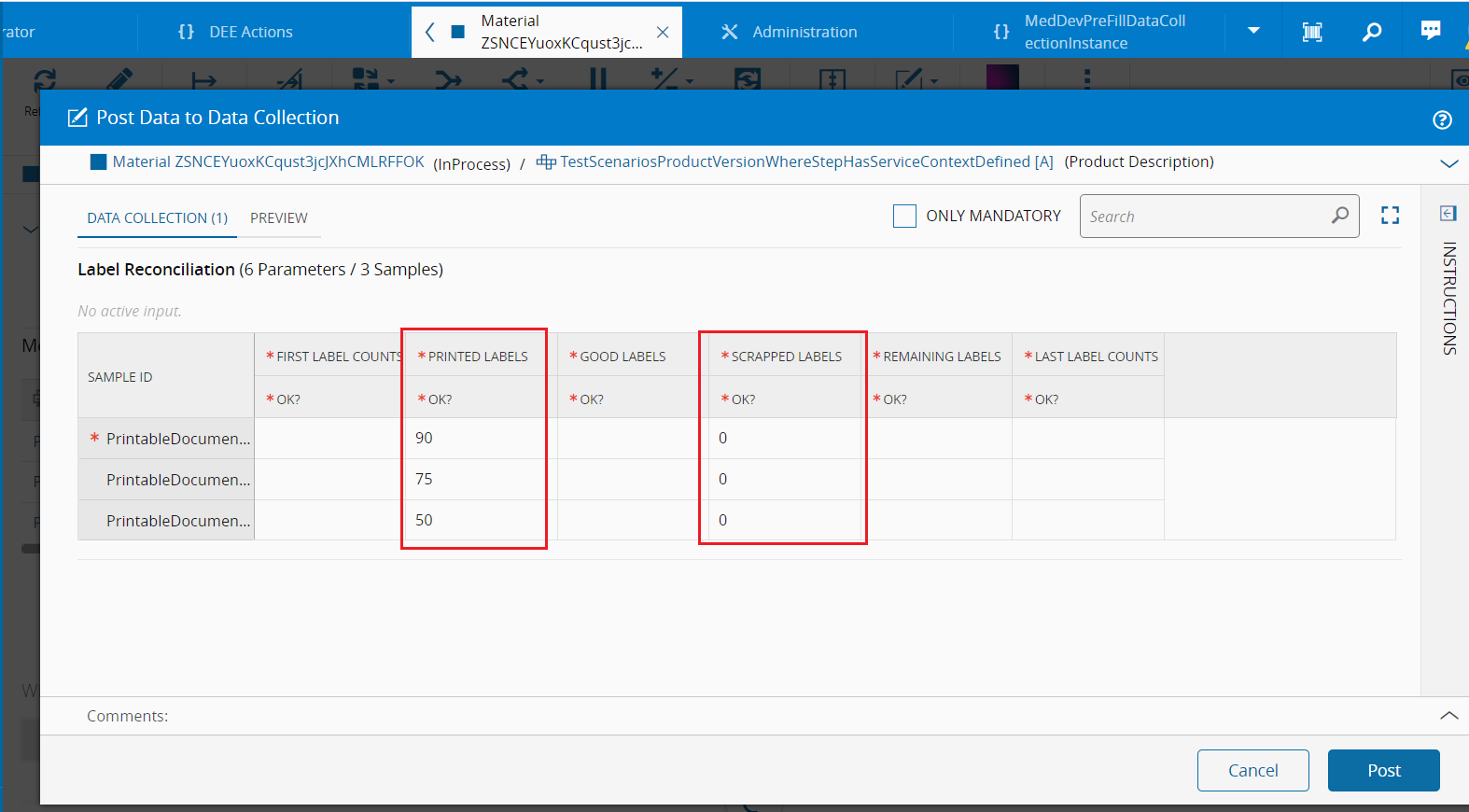 When verification Data Collections/Checklist are triggered, the user must input the configured data collection parameters for the step (e.g. scrapped labels + first & last label checks). Upon Data Collection Instance closure, the parameter values are persisted in the MedDevMaterialPrintableDocument relation, either incrementing or replacing the existing values depending on the parameter update mode.These parameter values are populated to the Data Collection Instance from the MedDevMaterialPrintableDocument relation.