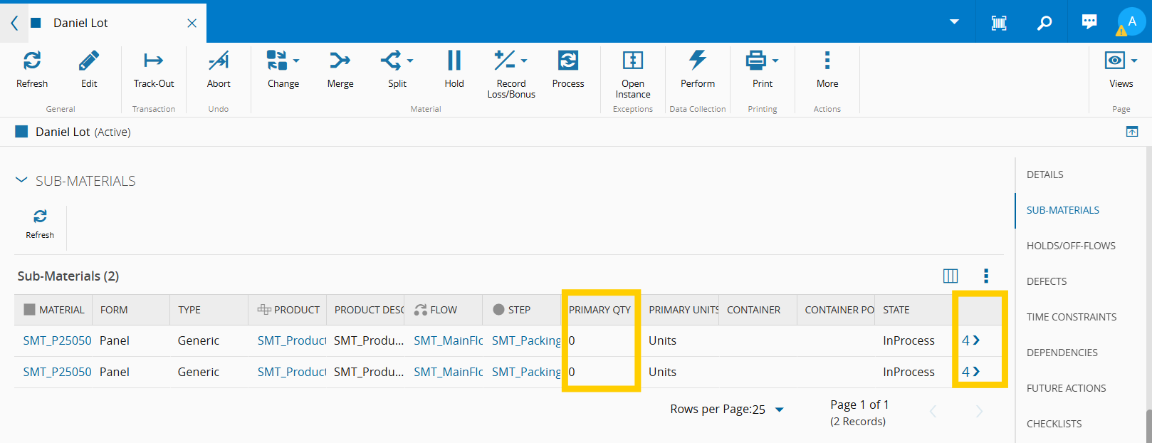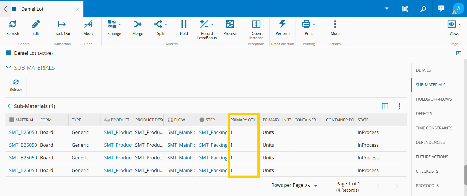 • 1 Lot material with a Primary Quantity of 0 with 3 Sub-Materials