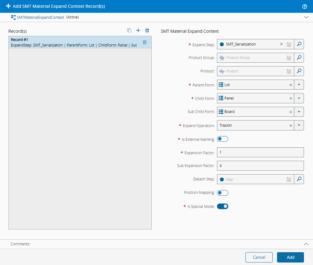When the Is Special Mode flag is set to true, two levels of serialization are performed within a single step (e.g., from Lot to Panels, then from Panels to Boards). Each material whose form matches the value defined in Parent Form and enters the specified Expand Step produces Child and Sub Child materials during that same step.