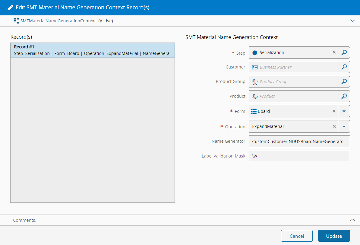 On the SMTMaterialNameGenerationContext ST, configure and derive, for boards and/or panels, the Name Generator to be applied if Is External Name was set to false. Define the following fields: