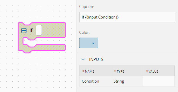 Represents the block text and associated fields, which can include special tokens to display inputs or outputs within the block. For example, {{input.Condition}} will show the Task Input as an editable block field. The prefixes input. or output. are required to display inputs or outputs, respectively.
