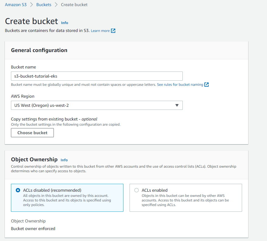 To create this resource, go to this dashboard ⧉ and select Create bucket. A page similar to the one below comes up. Fill out the bucket name and make sure that the AWS Region is the same as in the previous resources. All other configurations can be left with the default values.