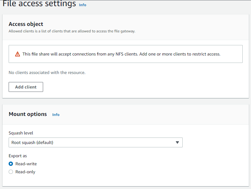 More information: https://docs.aws.amazon.com/filegateway/latest/files3/create-gateway-file.html and https://docs.aws.amazon.com/filegateway/latest/files3/create-nfs-file-share.html ⧉