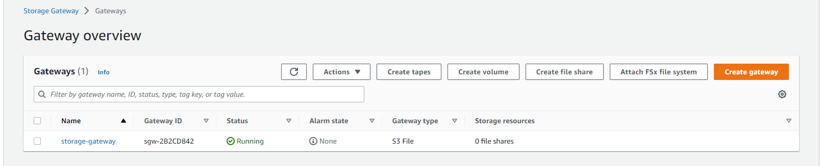 With the gateway ready, it is time to create the file shares. Besides having the gateway up and running, a S3 bucket resource needs to be created for each file share. Buckets are containers for data stored in S3.