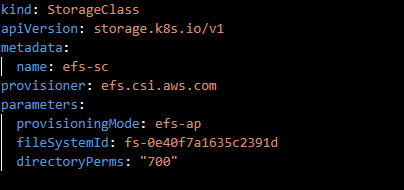 Run the following command to create the storage class. The Kubernetes service account named efs-csi-controller-sa is annotated with the IAM role that you created named AmazonEKS_EFS_CSI_DriverRole.