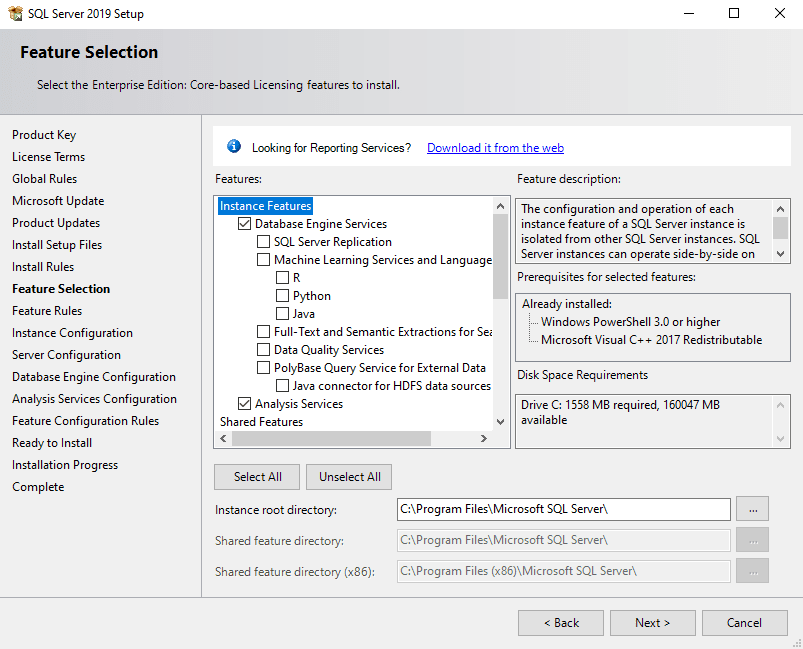 Reporting Services must be installed separately from this installation.