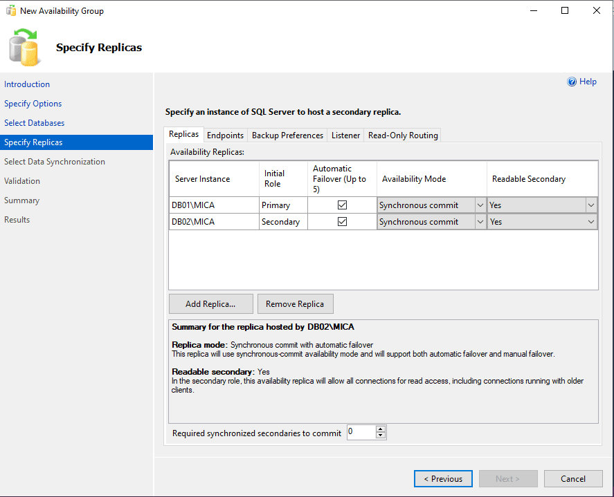 Next set the replicas that you need and set how you want the availability groups to work: