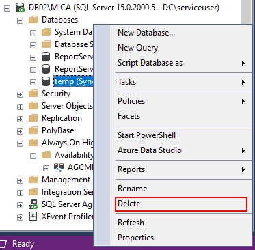 After creating the Availability Group, you can delete the temporary database. First remove the database from the Availability Group: