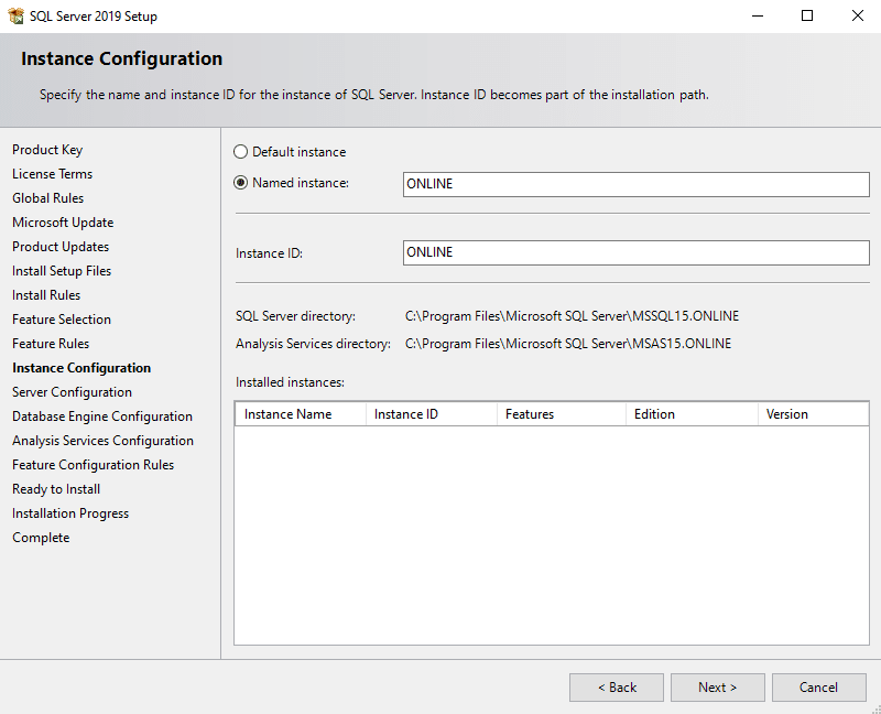 Next set the name of the instance to install. Critical Manufacturing recommends deploying three instances of SQL Server (Online, ODS and DWH) ideally on different physical machines. In that sense this procedure should be repeated for each of the instances.