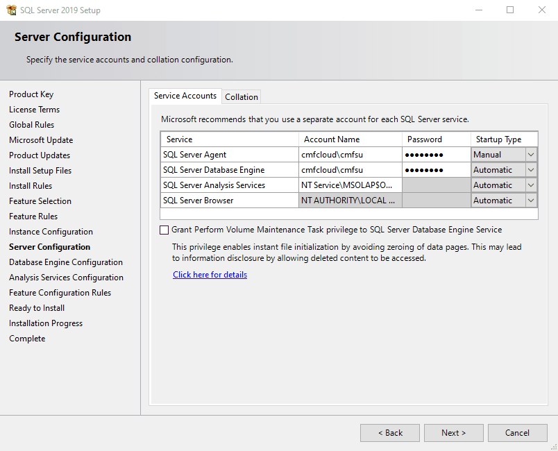 Next set the service account to run the engine service and the agent service. This account should be the domain account, which requires rights to access the file system.