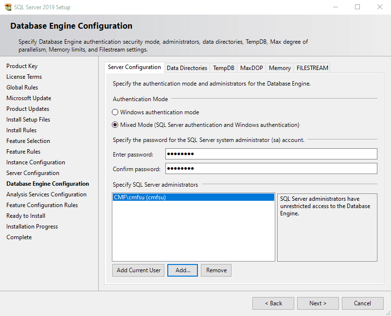 Now configure the database engine. Set the authentication mode to "Mixed mode" and set the sa account password to a value of your choice.