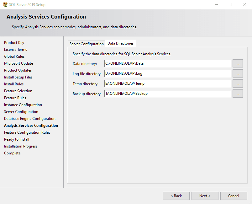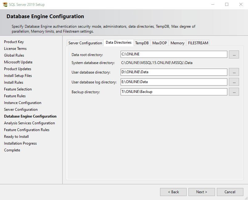 Now configure the data directories. Critical Manufacturing recommends separating the data files and at this moment you should have already prepared the disk drives on all nodes.