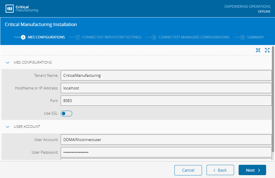 While this method provides a direct installation method for Connect Iot, Critical Manufacturing recommends using the automatic deployment method, which you can read about in Configure Automation Manager Deployment.