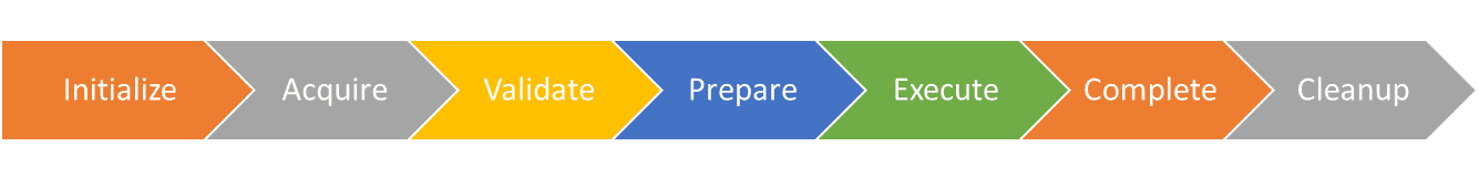 Each pipeline stage is executed for all packages to be deployed. The process only advances to the next stage after passing through all steps. All steps will first run initialize actions, then all steps will run subsequent acquire actions until cleanup is reached. The next points summarize what will be happening at each stage of the pipeline.