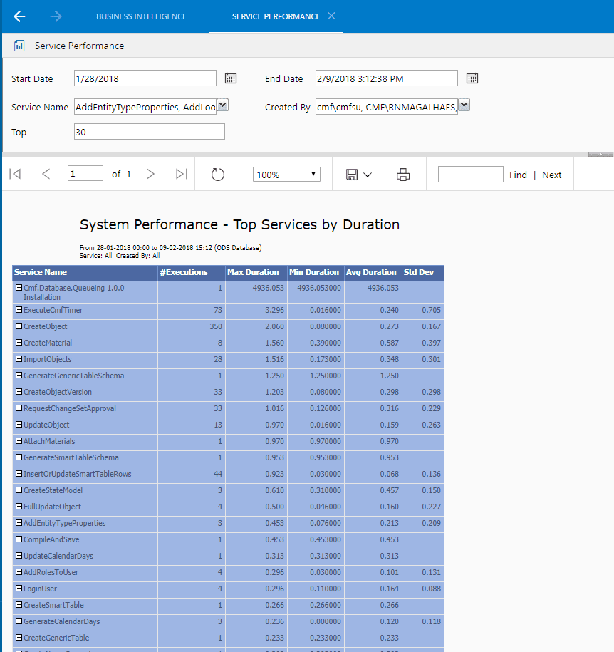 The standard report System/ServicePerformance provided in the default Critical Manufacturing installation can be used to access this information as shown in the next picture.