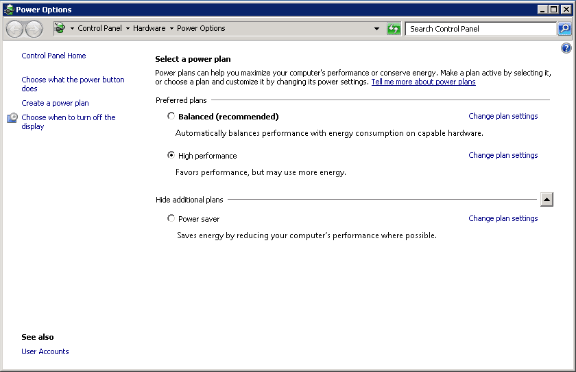 Power options can be accessed by typing powercfg.cpl. Servers must be configured for High Performance as shown in the picture below.