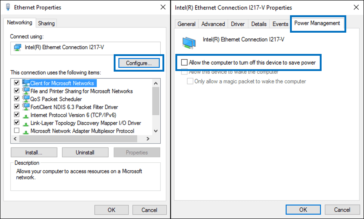 Network adapters can be configured in the Network and Sharing Center > Change Adapter Settings which can be accessed by typing ncpa.cpl. Disable the Allow computer to turn off this device to save power. option for all active network cards as shown in the next picture.