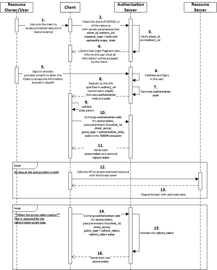 A client application makes an authorization request to an authorization endpoint, receives a short-lived authorization code, makes a token request to a token endpoint using the authorization code, resulting in an access token. If the access token expires, the client can request a new token from the token endpoint by specifying a refresh token as the grant type.