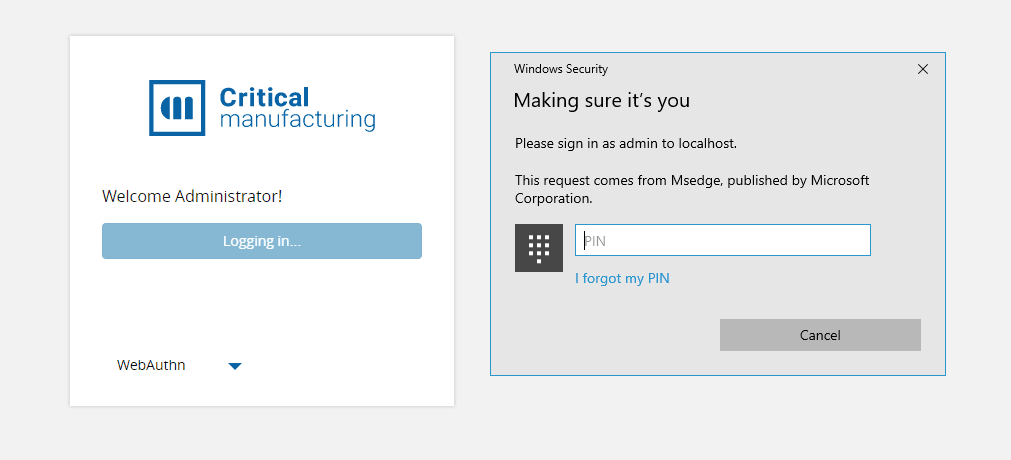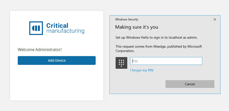 If a user is accessing the MES system using a browser that they had already registered as a WebAuthn authentication device, steps 1 and 2 are performed automatically by the system with no need for user interaction. In this scenario, the Windows Hello window is automatically displayed to the user and they only need to validate their device in order to access the MES interface.
