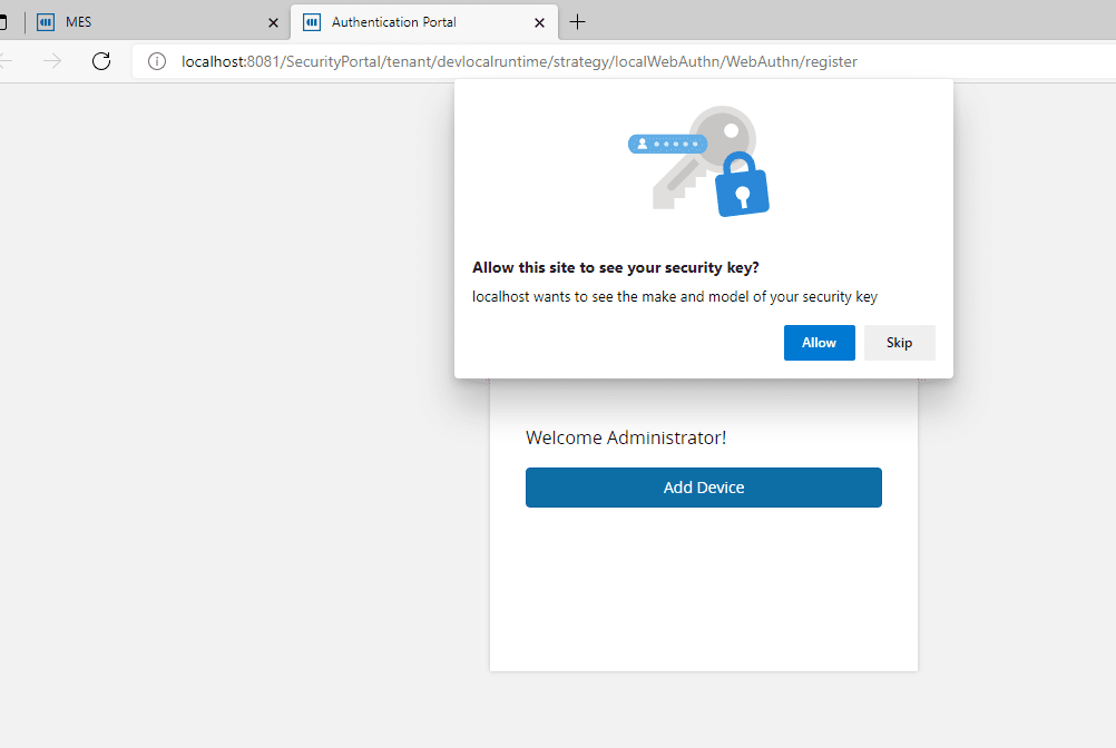 If a user is successfully authenticated in SecurityPortal, a new step will appear when accessing the MES for the first time, asking the user to register the device that they are currently at as a authentication device: