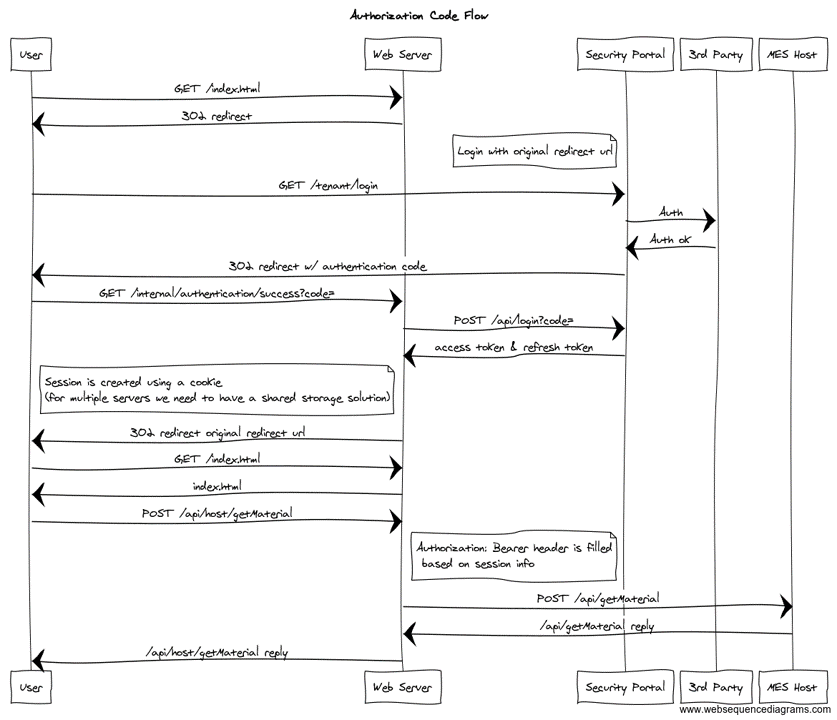 The interaction between a client application (example: MES User Interface) and security portal is established using OAuth 2.0 ⧉.