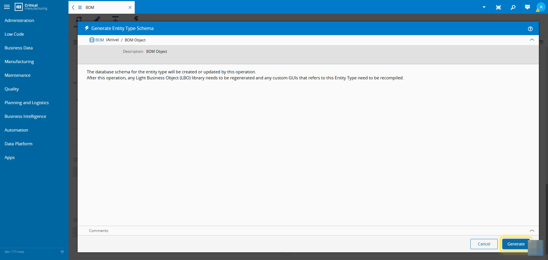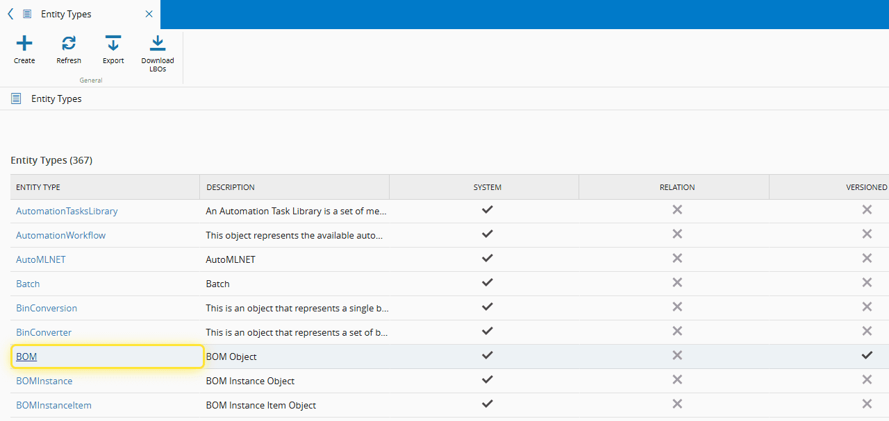 For more information, see Generating an Entity Type Schema - Critical Manufacturing Documentation Portal ⧉ .
