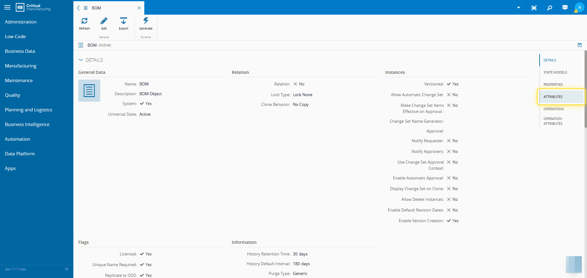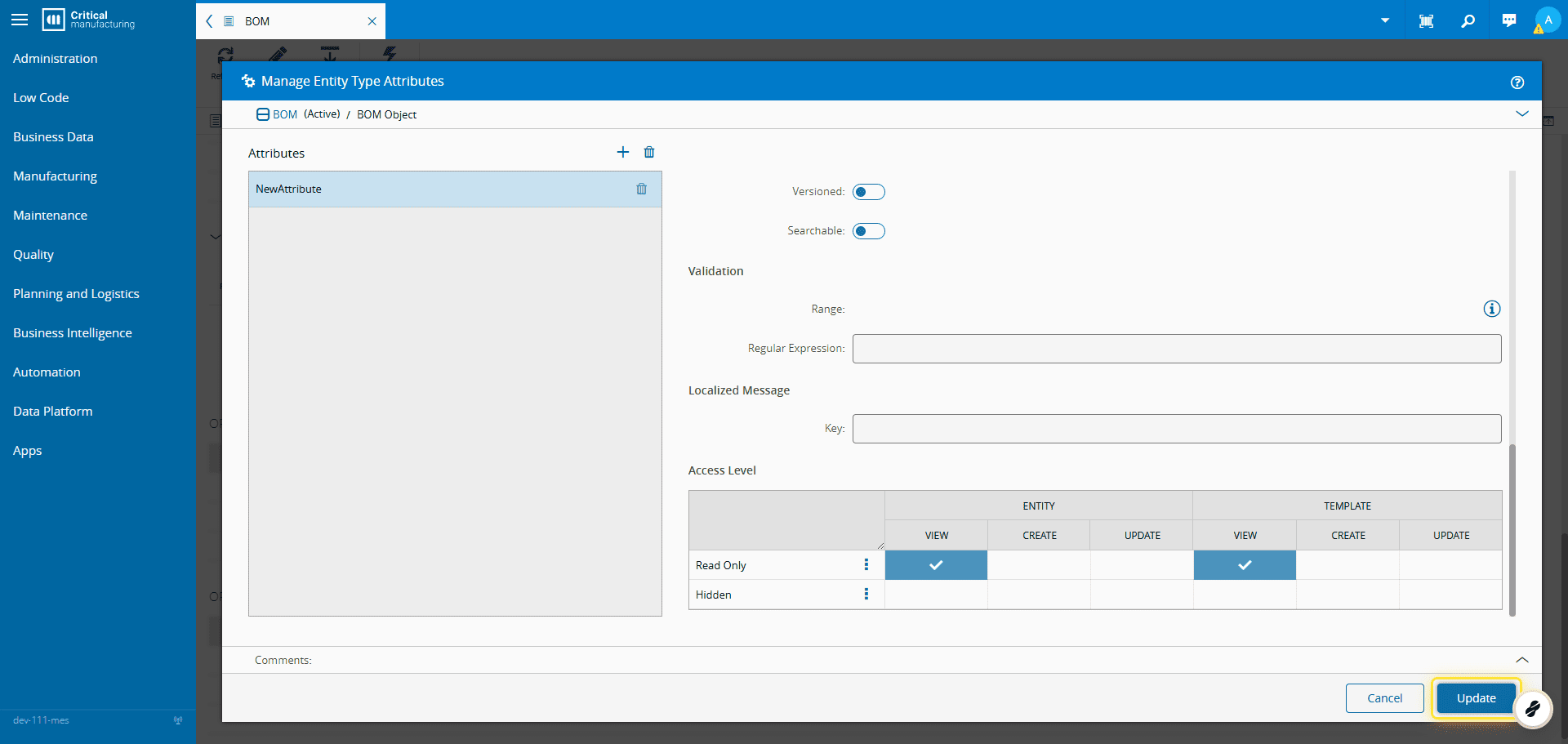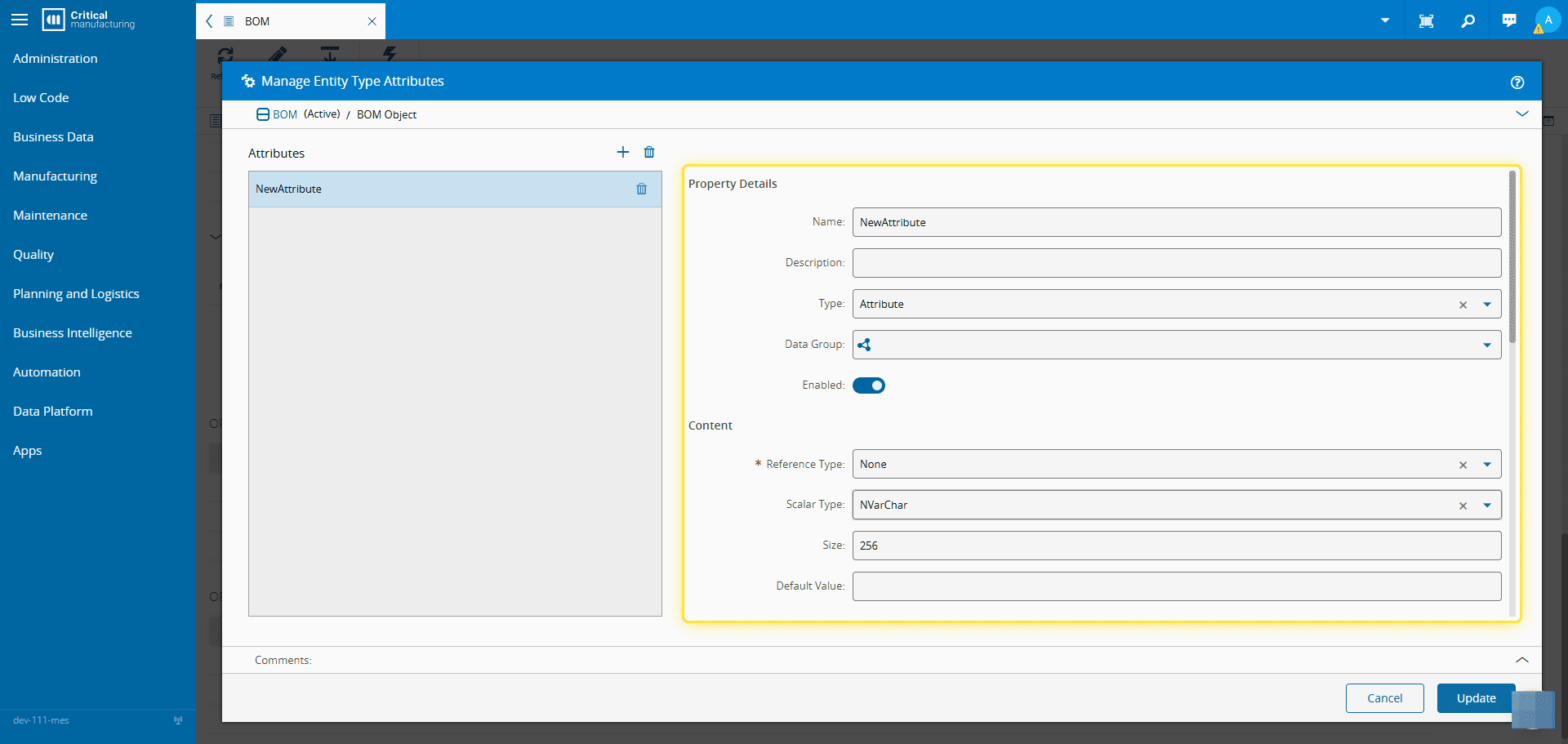 For more information, see Manage Entity Type Attributes - Critical Manufacturing Documentation Portal ⧉ .